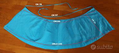 Gonnellina mini a "portafoglio" con lacci. Molto carina e usata pochissimo. In ottime condizioni. Ci sono piccole macchioline di titntura, già presenti, peraltro, quando l'ho acquistata. Foderata.