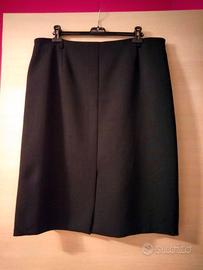 Gonna nera classica, semplice e lineare, elegante e pratica contempo, per tutte le occasioni. Tessuto simile al lino per lavorazione. Presenta piccolo spacco centrale, posteriore e anteriore di circa 20 cm. Passanti piccoli in vita per cintura. Misura: 40 cm (vita) x 60 cm (fianchi) x 68 cm (lungh.)