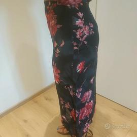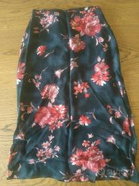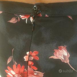 Gonna longuette caratterizzata da una base nera con una vivace stampa floreale rossa. Il tessuto leggero, dona un effetto fluido e leggermente trasparente verso l'orlo. - Chiusura lampo e bottone. - Sottoveste nera incorporata. - Taglia 40. - Misure approssimative lunghezza 72 cm, larghezza 32 cm circa.