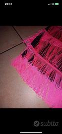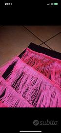 Gonna nera in jersey elastico con frange rosa, cucita a mano, stile Charleston. Vita max 52 cm, bacino 52 cm, lunghezza 35 e 43 cm