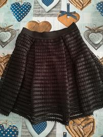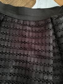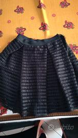 Vendo gonna colore nero in pizzo con sottogonna in maglina, elastico alto in vita e chiusura con cerniera sul fianco. Larghezza vita cm 60, lunghezza cm 42