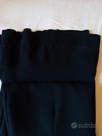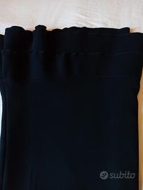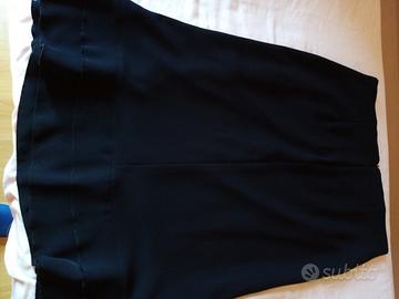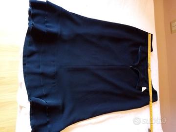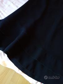 Gonna nera con balze al fondo, poliestere, foderata, zip sul fianco, larga punto vita 42 cm, lunga 70 cm. La gonna riporta taglia 50 ma fare riferimento alle misure che ho dato (punto vita 84 cm). Di 20 anni fa, poco usata. Nelle foto può sembrare blu ma è nera.