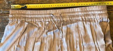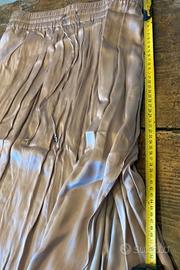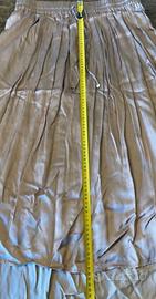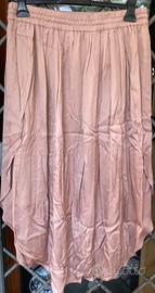 Bellissima gonna lunga color rosa chiaro, taglia L. Perfetta per occasioni speciali o per un look casual chic. - Modello a trapezio, con spacchi laterali. - Tessuto morbido e fluido. - Ottime condizioni. Misure : lunghezza 82 cm, spacco 40 cm, vita 41 cm (con elastico). 100% viscosa.