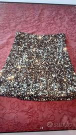 Gonna corta con paillettes dorate, foderata internamente nero, cinturino in vita .lunghezza cm 41
