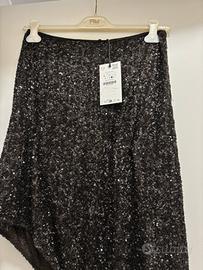 Gonna con paillettes marca Zara, nuova con cartellino, taglia L, colore marrone scuro (anche se in foto sembra nera), modello midi a vita media con dettaglio di applicazione di paillettes, orlo asimmetrico, chiusura con cerniera nascosta nella cucitura. Prezzo 28€ escluse ss.
