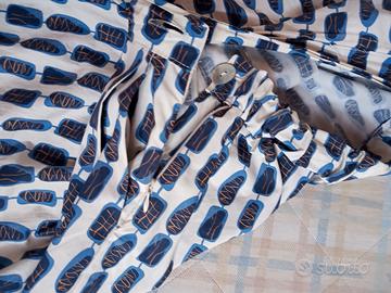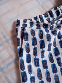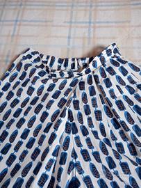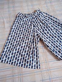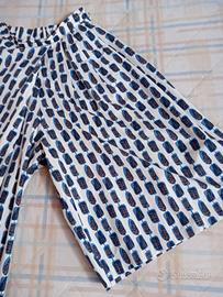 Bellissima gonna pantalone a vita alta, con una stampa a motivi blu e bianchi su sfondo bianco.