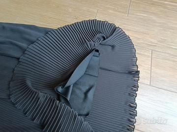 Gonna plissettata in georgette nera, foderata con una comoda fodera elastica. Adatta anche ad outfit eleganti. E' impreziosita da un elastico in vita molto bello,( in foto non rende) alto cm.5, argentato. Grazie a questo elastico ha un'ottima vestibilità, infatti veste le taglie small e medium. Le misure sono: lunghezza gonna cm.71, larghezza vita minimo cm.62, massimo cm.90, altezza elastico in vita cm.5. Gonna nuova, mai usata.