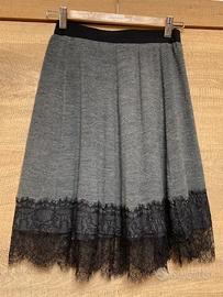 Vendo gonna marca Rinascimento, taglia XL che veste una taglia 40/42. In leggera lanetta colore grigio, bordata con morbido pizzo nero, gros grain in vita con fiocco. Usata ma tenuta bene.