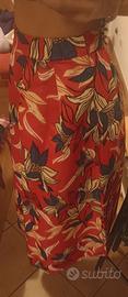 Gonna fantasia con base rossa e fiori blu,beige e contorni neri. a vita alta, rigida.