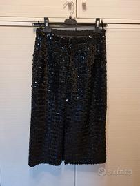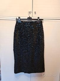 Gonna sartoriale di paillettes nera, longuette, interamente foderata internamente, con chiusura lampo posteriore.