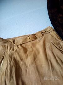 Gonna in morbida pelle scamosciata color cammello con tasche sui fianchi e cintura in vita. Foderata