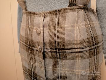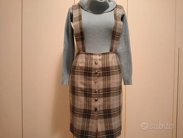 GONNA SCOZZESE AZZURRO GRIGIO IN PURA LANA CON DUE BRETELLE. APERTURA FRONTALE CON BOTTONI RIVESTITI. MANIFATTURA SARTORIALE. INDOSSATA POCHE VOLTE, NESSUN DIFETTO NE’ SEGNI DI USURA. MAGLIA ESCLUSA.