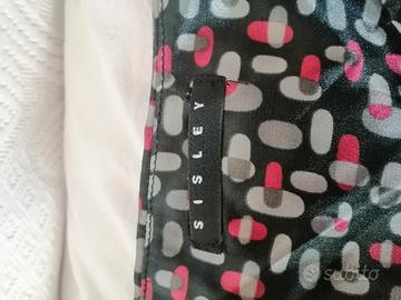 Gonna sisley plissettata tg 38. fascioncino liscio dal quale parte l'applicazione della gonna plissettata cucita da un nastro nero in grogren. Molto carina colori luminosi nei toni del grigio, nero argento e borgogna. Vita cm 36 Fianchi cm 43 Lunghezza cm 55