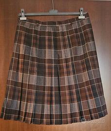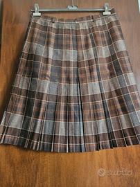 Gonna midi (o lunguette) plisettata con motivo scozzese (tartan) nei toni del marrone, grigio e beige. Intramontabile classico, con rivisitazioni contemporanee di grande attualità. Cinturetta con 4 passanti. Chusura con bottone e zip nascosta. Tessuto certificato 100% pura lana vergine. Foderata. Made in Italy. Lavaggio professionale in lavanderia. Circonfereza vita 93, fianchi 106, lunghezza 68 (misure in centimetri).
