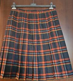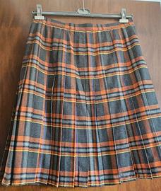 Gonna plisettata con motivo scozzese (tartan) nei toni del marrone, arancione e nero. Rivisitata in chiave moderna, il tartan è tendenza, per uno stile senza tempo. Con fodera. Tessuto 50% lana, 45% poliestere, 5% altre fibre. Made in Italy. Circonferenza vita 90, fianchi 104, lunghezza 70 (misure in centimetri).