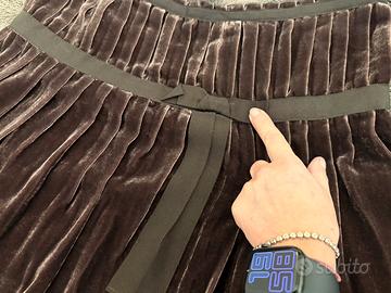 Deliziosa gonna di juicy couture colore moka, taglia 0 (38 it) velluto di seta, vita bassa, rifinita in grogren marrone. Lunghezza 39.35 e larghezza vita 37.50, fianchi 41.50