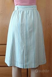Gonna in fresco di lana, color bianco panna con righe verticali grigie e azzurre.
