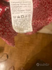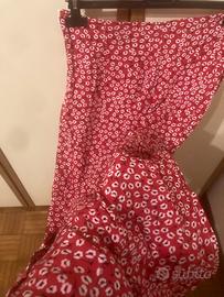 Vendo gonna a vita alta rossa (dimensioni vita 85 cm, dimensioni fianchi 112 cm), sfoderata, mai utilizzata. Motivo floreale bianco e nero. Chiusura a cerniera laterale. Non elastica. Lunghezza metà ginocchio (circa 90 cm), con spacco laterale da sopra il ginocchio.