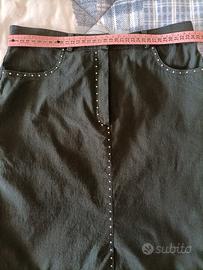 Gonna estiva lunghezza sotto il ginocchio, nera con motivi in perline argento, chiusura con zip centrale, spacco sul davanti, due tasche davanti e due dietro. 98% cotone, 2% elastam. tg. 42, misure nelle foto. Perfetta, come nuova.