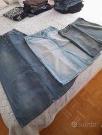 Nr 3 gonne jeans. Diversi colori e lunghezza. Lunga taglia 38. Longuette chiara Benetton taglia 42. Corta marca Pickwick taglia L vendo 20 euro tutte e 3