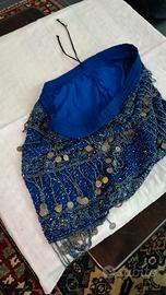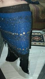 Gonnellina per tribal belly dance colore viola con monetine e perline. Tessuto gonna cotone, interno foderato. Larghezza vita 48 cms, lunghezza gonna con pendenti 52. Laccetto per stringere la dimensione della vita, utilizzata una sola volta.