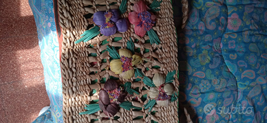 Ampia borsa di paglia con rivestimento interno in tessuto, mai usata. Decorazioni esterne floreali con colori vivaci. Estiva, comoda, dimensioni lunghezza cm.50 , altezza cm.30 . Ritiro Lugo di Romagna e Bologna.