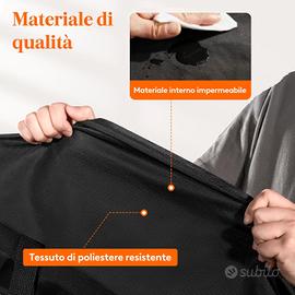 Grande Borsa Pieghevole 180L •Questa borsa capiente è perfetta per trasportare oggetti voluminosi durante i viaggi o i traslochi •Materiali di qualità: realizzata in resistente poliestere impermeabile e anti-strappo, con bordi rinforzati per una maggiore durabilità. I manici in cinghie larghe e spesse offrono un’eccellente resistenza ai carichi pesanti. •Manici rinforzati: i manici a tutta lunghezza, con cuciture rinforzate, supportano fino a 20/25/30 kg, permettendo un trasporto sicuro anche per oggetti più pesanti. •Ampia apertura e cerniera resistente: il design con apertura larga rende facile l'accesso agli oggetti, mentre la cerniera bidirezionale garantisce una chiusura sicura e resistente nel tempo. •Versatile e funzionale: perfetta per traslochi, viaggi, attività all’aperto, campeggio o per conservare decorazioni natalizie e biancheria da letto voluminosa come cuscini e coperte.