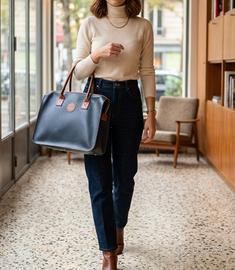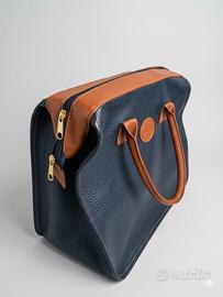Borsa Avon caratterizzata da un corpo in ecopelle martellata blu scuro e dettagli a contrasto in cuoio marrone. Misure 38x28x18cm Ideale per contenere documenti, laptop o come bagaglio a mano compatto.