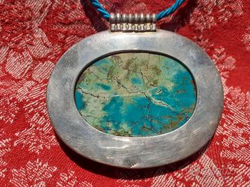 Grande ciondolo in argento sterling 925 con pietra turchese naturale e corallo. Con corda in cotone azzurro e chiusura in argento.