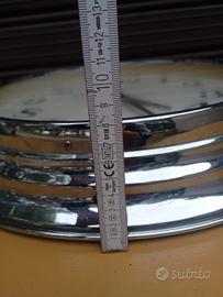 Grande orologio da parete vintage Fondo bianco con numeri e lancette nere. Cornice in metallo cromato. Massimo diametro 40 cm. Spessore cornice 8 cm.
