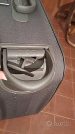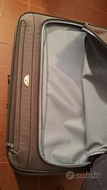 Grande valigia marchio Samsonite semirigida in tessuto colore Grigio/Marrone, su ruote, con maniglia, cinghia e nastro per traino, varie tasche/scomparti con cerniera.