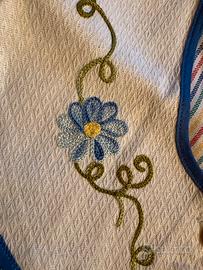 Smanicato con ricamo nella parte superiore, con due comodi tasconi e bottoni su tutta la lunghezza del vestito.