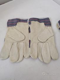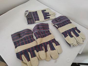 Guanti da lavoro resistenti con inserti in pelle. - Tessuto a righe blu e rosse. - Dettagli in pelle beige sulle dita e sul palmo. - Polsino in tessuto. - prezzo indicativo per un solo paio di guanti