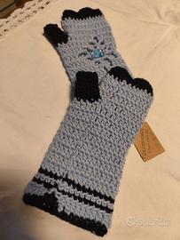 Guanti senza dita in lana merinos, lavorati all'uncinetto di colore azzurro e blu.