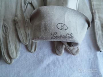 Guanti vintage in pelle di capretto color crema e grigio/bianco, anni '50, lunghezza al polso, moda di metà secolo, taglia piccola/media.