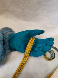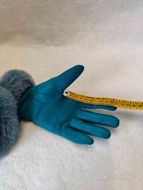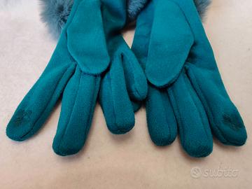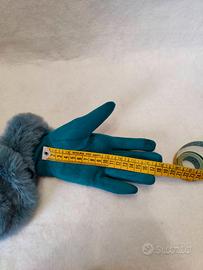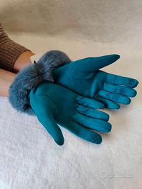 Guanti da donna, eleganti color turchese/ottanio con bordo in ecopelliccia. Polsino voluminoso, molto morbidi. Tessuto effetto scamosciato. Tutte le misure sono visibili in foto.