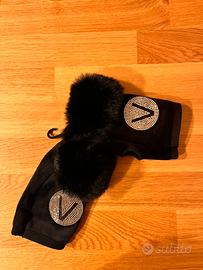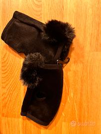Vendo guanti neri senza dita, scamosciati, con applicazioni di brillantini e pelo sintetico. Mai usati, ancora con gancetto.