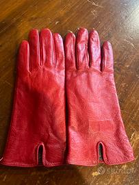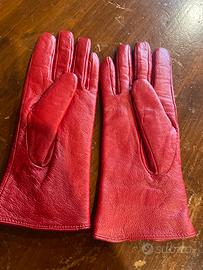 Un paio guanti rossi in pelle foderati . Dal dito medio 24 cm., misura polso 9,1/2 e misura palmo 9, 1/2
