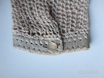 Guanti Vintage anni '50, in cotone beige, con bottoncini madreperlati e polsino in pelle. In perfette condizioni. Taglia 6.5/7 Misure: A 8cm / B 22cm