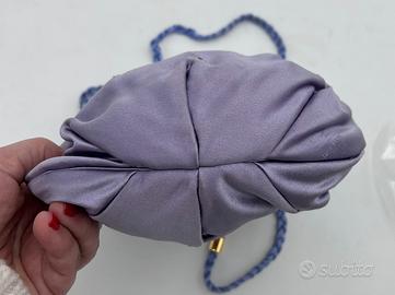 Borsa a tracolla da sera Anni '50 in raso lilla, interno a contrasto con piccola tasca chiusa da zip. Hardware in metallo dorato.