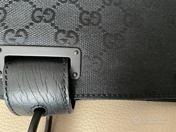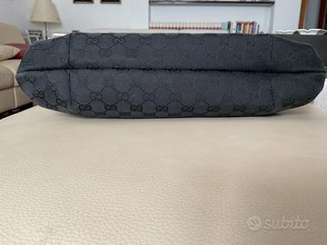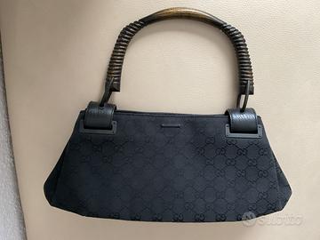 Gucci iconica borsa realizzata in tela Canvas nera con finiture in pelle . Piccolo placchetta metallica, manici in Bamboo elementi storici del design della maison ECCELLENTI condizioni, mai utilizzata senza difetti , com0leta di dust bag