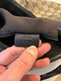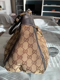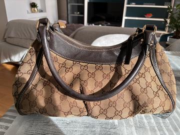 Borsa Gucci originale, modello hobo in tela GG canvas beige/marrone con finiture in pelle marrone e dettagli hardware dorati. modello iconico della maison, caratterizzato dal classico monogram GG e dall’elegante dettaglio frontale con anello metallico (stile horsebit/D-ring). La borsa è in buone condizioni generali: •tela esterna ben conservata •pelle con normali segni di utilizzo •interni puliti •cerniera perfettamente funzionante Capiente e comoda da portare a spalla, ideale sia per uso quotidiano che come pezzo vintage.