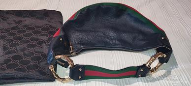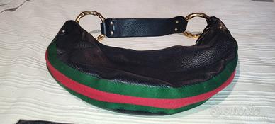 Vendo splendida borsa Gucci originale modello hobo/mezzaluna in pelle martellata nera, con iconica banda Web verde/rossa e dettagli hardware dorati. Borsa elegante ma comoda, molto attuale nello stile e ideale per uso quotidiano o outfit casual chic. Completa di dust bag Gucci originale. ✨ Condizioni ✔ Esterno in pelle in ottime condizioni (normali pieghe d’uso) ✔ Interno perfetto, pulito e senza macchie ✔ Zip funzionanti e marchiate Gucci ✔ Hardware dorato in buono stato ✔ Nessuno strappo o difetto strutturale