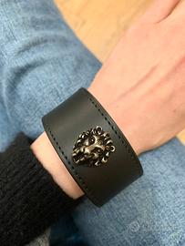Splendido ed accattivante bracciale Gucci Lionhead wristband leather bracelet, grey metal & harness leat, taglia M.