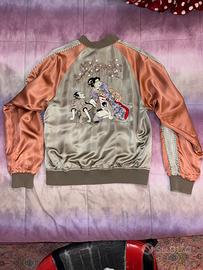 iconico bomber Gucci in seta e viscosa, stampa collezione esclusiva kimono giapponese (figure stilizzate, draghi, aironi sakura, fiori e dettagli audaci). Made in Italy, condizioni buone, oversize unisex. Etichetta originale Gucci.
