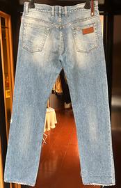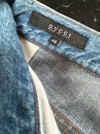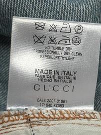 Jeans Gucci, taglia 48 italiana, sarebbe una US 32, capo originale ,realizzati in denim di alta qualità con lavaggio chiaro effetto délavé e leggera usura creta artificialmente dalla casa madre per dare un tocco di stile vintage. Modello sei tasche con vestibilità regolare e lunghezza totale 110 cm, caratterizzati frontalmente da chiusura con bottone e zip entrambi legati, cuciture a contrasto e piccolo dettaglio Web verde e rosso sulla tasca. Mentre sul posteriore presentano iconico patch in pelle con logo Gucci Made in Italy ,cinturino con nastro Web verde rosso applicato e bottone metallico, oltre a tasche posteriori con leggere abrasioni di fabbrica che esaltano il look autentico, condizioni ottime ideali per outfit casual e streetwear di fascia alta.