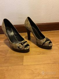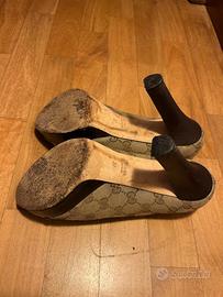 Queste sono décolleté Gucci originali, caratterizzate dal monogramma GG beige ed ebano su tela, dettaglio morsetto in metallo e punta aperta.