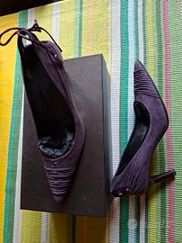 Décolleté Gucci in camoscio dark purple con punta a punta e dettagli arricciati. Suola in cuoio. Taglia 36 C Nuovo con scatola originale.