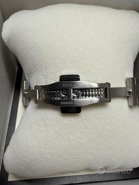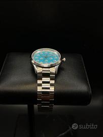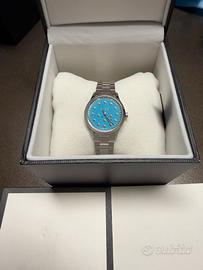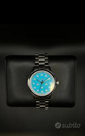 Gucci G-Timeless "Bees" YAI264|54 Watch Acciaio Lapis 32mm Api Donna. Modello: Gucci G-Timeless "Bees". • Quadrante: Colore celeste/azzurro pastello con finitura lucida. La particolarità risiede negli indici delle ore, sostituiti dall'iconico simbolo dell'ape (bee) in metallo argentato, uno dei motivi più celebri della maison. • Cassa: Acciaio inossidabile con un diametro di circa 38 mm (misura unisex). • Bracciale: Acciaio a tre maglie con chiusura a farfalla. • Movimento: Quarzo Swiss Made (alta precisione). • Vetro: Cristallo zaffiro antigraffio con trattamento antiriflesso. Quadrante in Pietra Naturale: "Il pezzo forte di questo segnatempo è il quadrante realizzato in vera pietra di Turchese. La presenza delle venature naturali rende ogni pezzo unico al mondo: non esistono due quadranti identici." Completo di scatola