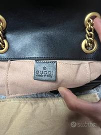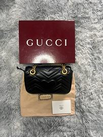 Vendo splendida borsa Gucci modello GG Marmont in pelle nera, caratterizzata dall’iconico logo GG dorato frontale e lavorazione trapuntata che la rende elegante e senza tempo, simile all’originale. La borsa è in condizioni eccellenti, pari al nuovo, completa di: * Scatola originale * Dust bag (sacca protettiva) * Specchietto portatile Gucci Dotata di tracolla a catena dorata, può essere indossata sia a spalla che a tracolla. Perfetta per occasioni eleganti ma anche per uso quotidiano. Dettagli: * Colore: nero * Materiale: pelle * Chiusura con patta e bottone magnetico * Logo GG in metallo dorato * Interno ben organizzato Disponibile per consegna a mano o spedizione. Contattami per ulteriori foto o informazioni!